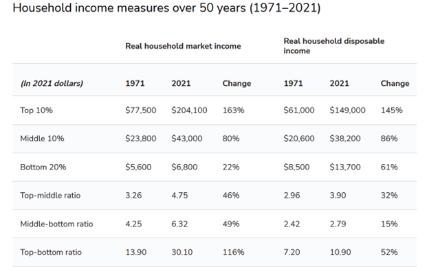Table from the Federal Reserve Bank of Minneapolis October 2023 report Telling the nuanced story of economic inequality in the U.S., layer by layer. The table shows the increasing difference over time in the value of time, according to an individual’s economic ranking.