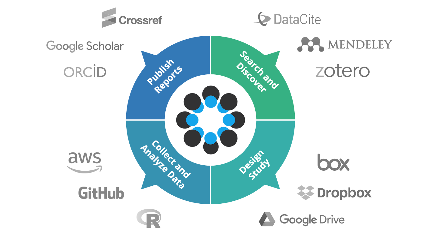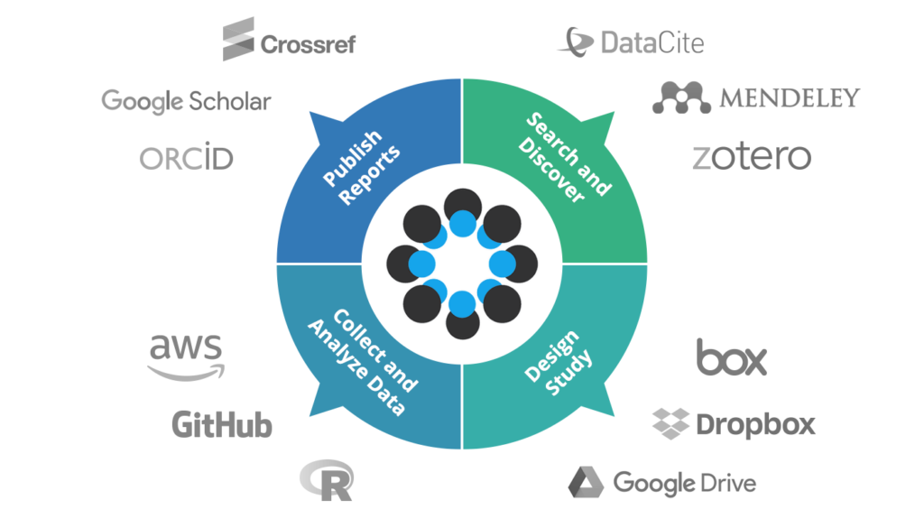 Examples of tools which can be integrated with an OSF account. “The OSF is an open-source platform to manage, share, and publish your research outputs, from documenting your study design and planning methods, through data collection and analysis, to final publication and dissemination.” Credit: Center for Open Science.