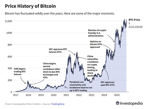 Graph of historical Bitcoin value fluctuations, noting significant drivers, from Investorpedia .