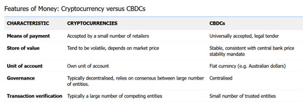 Comparison of cryptocurrency and CBDC features from the Reserve Bank of Australia.