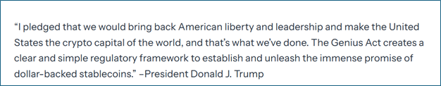 July 18, 2025 statement on the White House website, on the signing of the GENIUS Act.