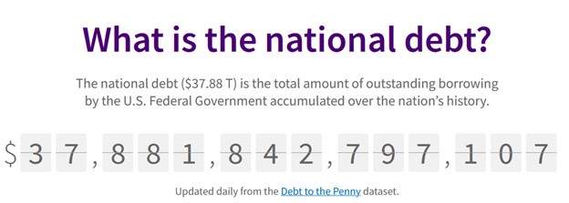 Daily tracking of the U.S. government’s debt, as at October 4, 2025, from the Department of the Treasury. Of the nearly $38 trillion total, $1.973 trillion was added in the latest fiscal year ended September 30, 2025.