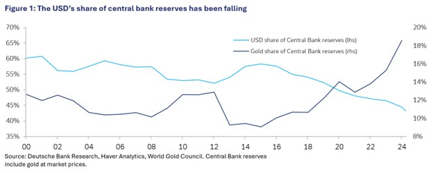 The rapidly decreasing share of the U.S. dollar in global central bank reserves is illustrated in this chart from the Deutsche Bank Research Institute’s September 2025 report Bitcoin vs. Gold: The Future of Central Bank Reserves by 2030.